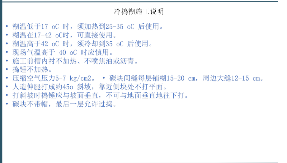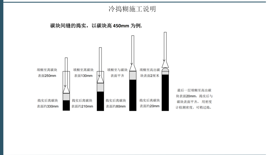 ??蟃型冷搗糊可以在17-42 °C的常溫范圍內(nèi)施工,施工時(shí)沒有瀝青煙 害,改善了施工人員的作業(yè)環(huán)境;??侠鋼v糊按國(guó)際標(biāo)準(zhǔn)設(shè)計(jì),抗熱震性好、焙燒收縮率小于0.15%、搗實(shí)性好、不分層。??厦赓M(fèi)提供密度計(jì),用于在施工現(xiàn)場(chǎng)測(cè)定糊的搗實(shí)密度。